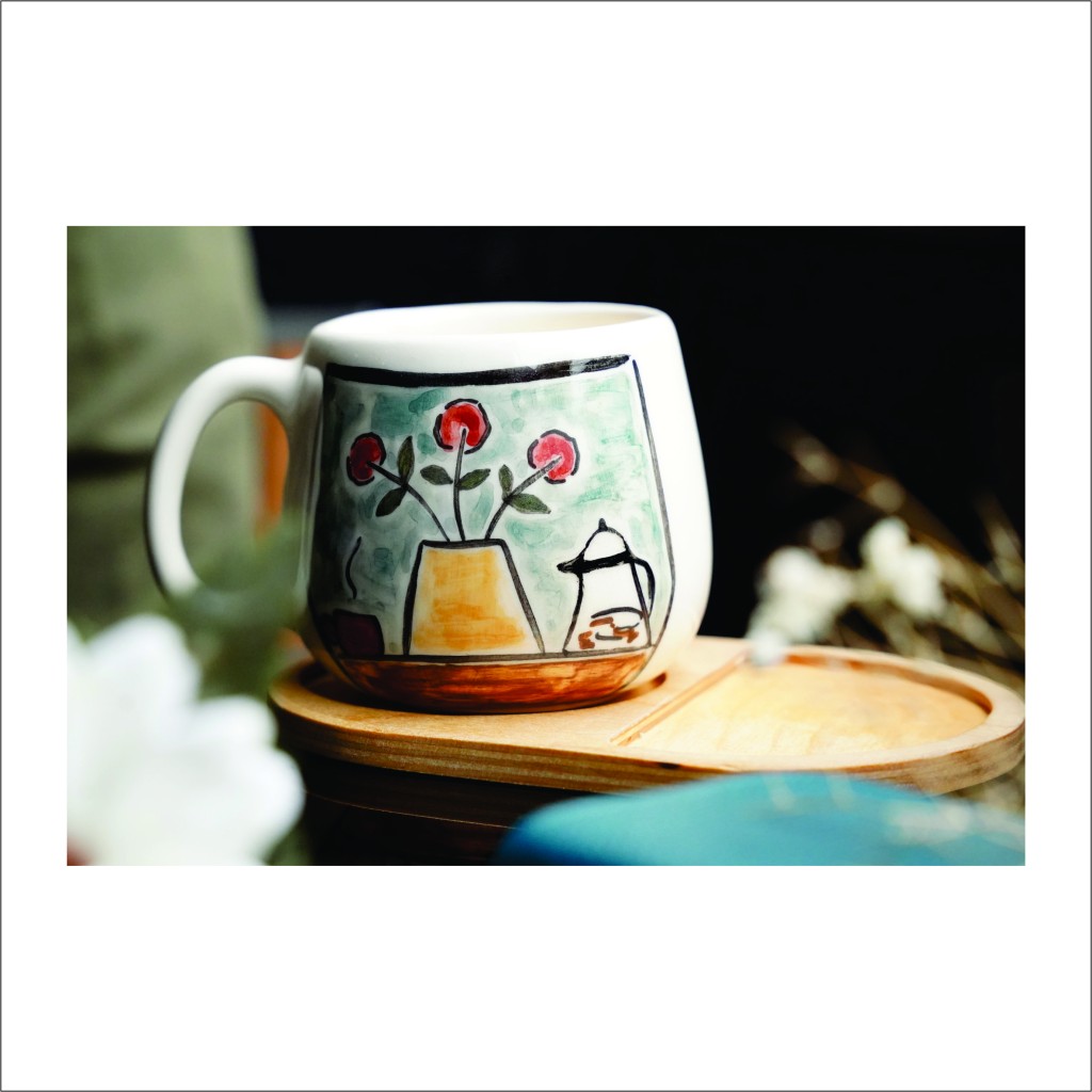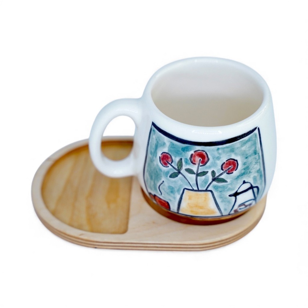 لیوان سرامیکی دستساز بهمراه پیش دستی چوبی طرح پنجره