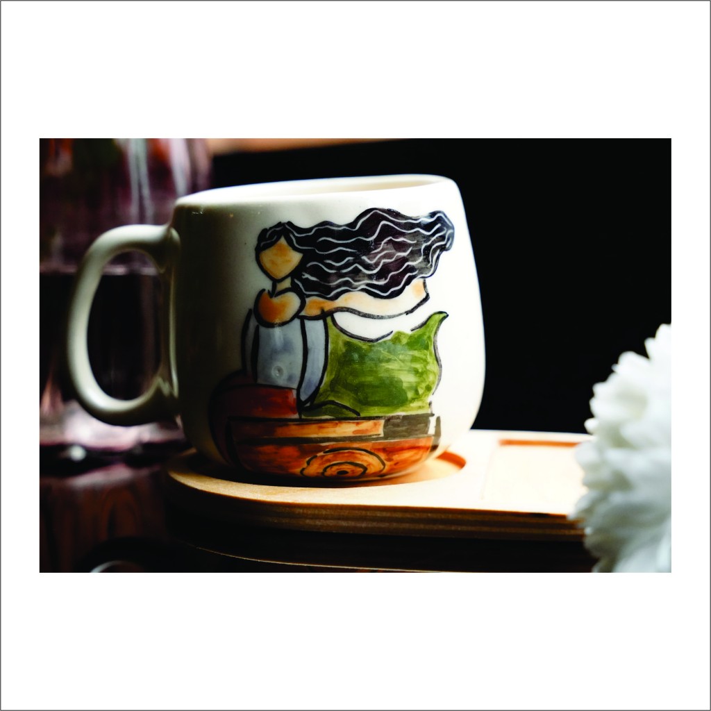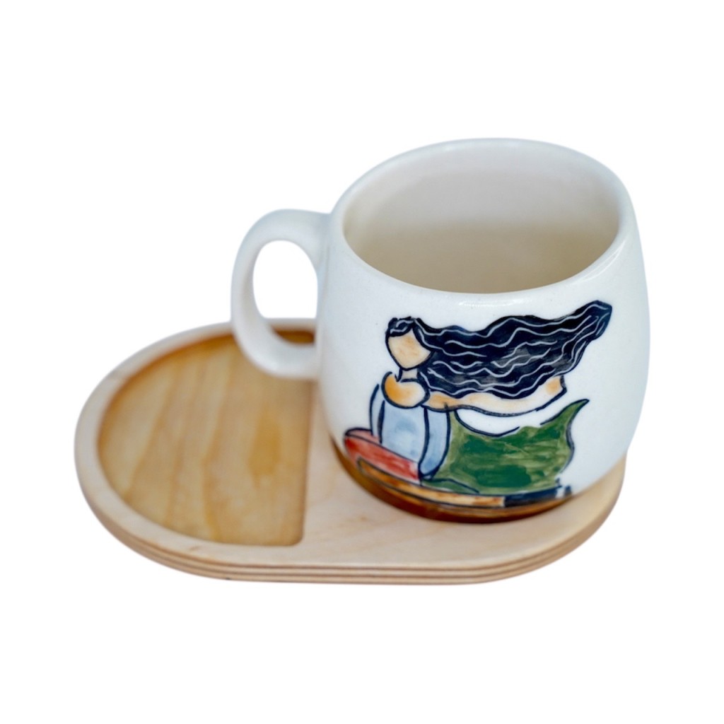 لیوان سرامیکی دستساز بهمراه پیش دستی چوبی طرح عکاس
