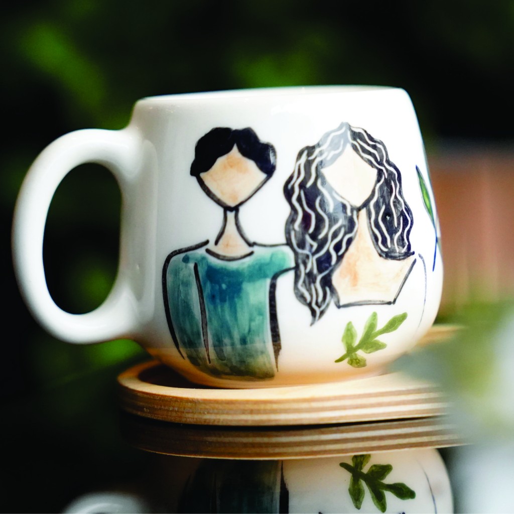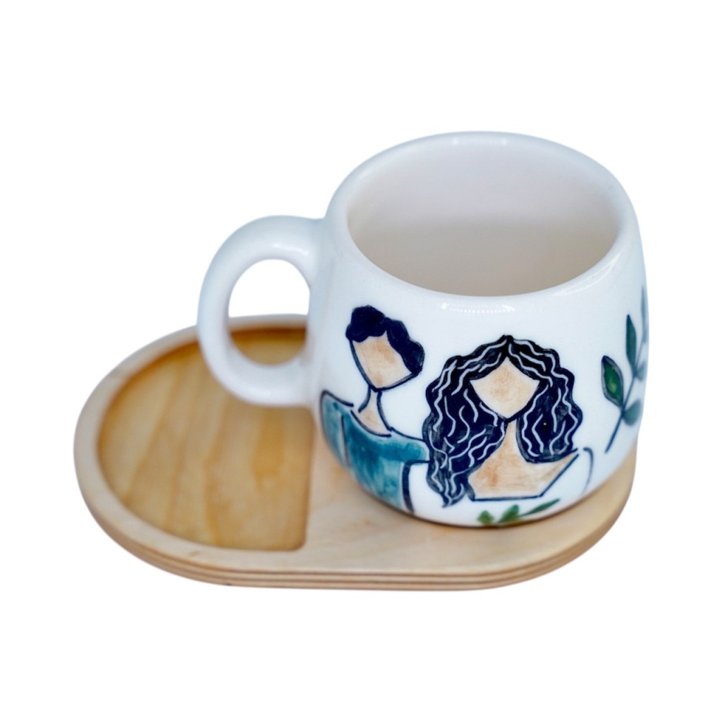 لیوان سرامیکی دستساز بهمراه پیش دستی چوبی طرح قصه ما