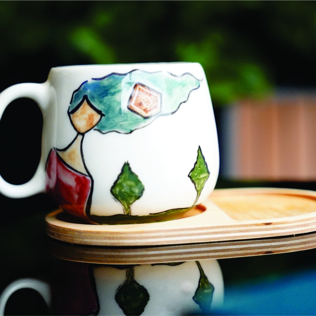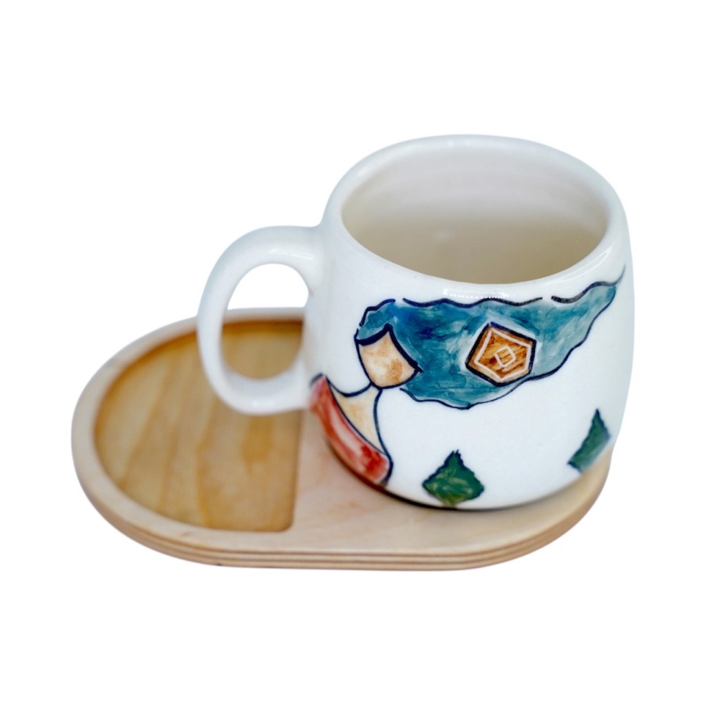 لیوان سرامیکی دستساز بهمراه پیش دستی چوبی طرح گیسو