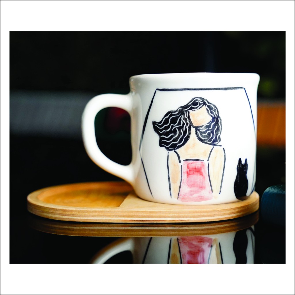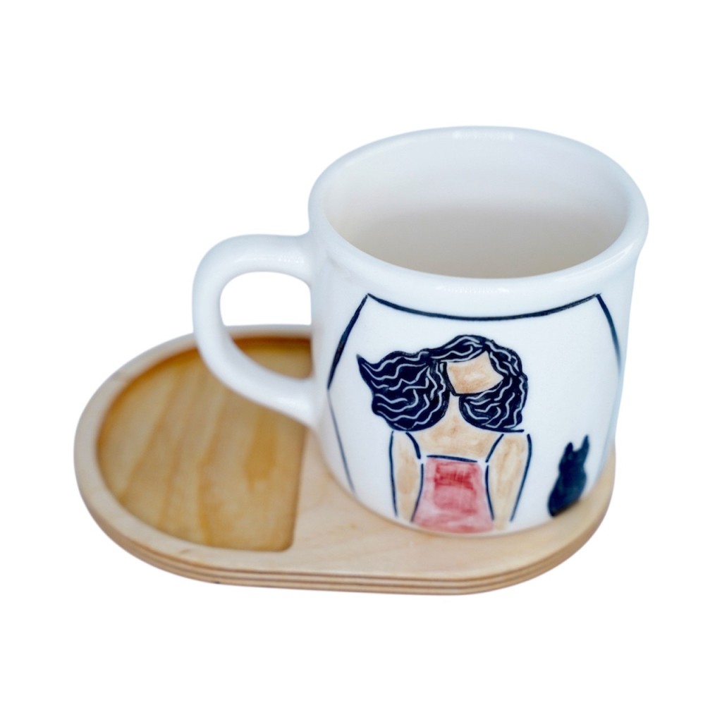 ماگ سرامیکی دستساز بهمراه پیش دستی چوبی طرح دختر و گربه