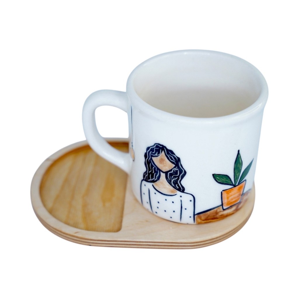 ماگ سرامیکی دستساز بهمراه پیش دستی چوبی طرح دختری در کافه