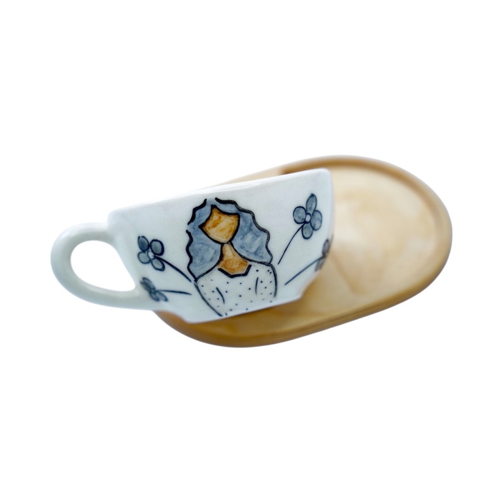 لته خوری سرامیکی دستساز بهمراه پیش دستی چوبی طرح دخترک و گل