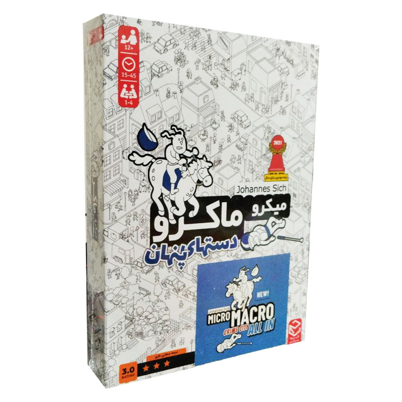 | سایر توضیحات | -بازی ایرانی میکرو ماکرو 3 MicroMacro:all in crime city-سرنخ های کوچک را برای حل پرونده های بزرگ پیدا کنید.-تعداد نفرات: 1 تا 4 نفر-زمان بازی: حدود 15 الی 45 دقیقه-مناسب برای بازیکنان بالای 12 سال-محصول گروه : چارپایه-طراح بازی : Johannes Sich-برنده جایزه بهترین بازی سال دنیا در سال 2021-15 نامزدی در جوایز جهانی و برنده 5 جایزه جهانی |