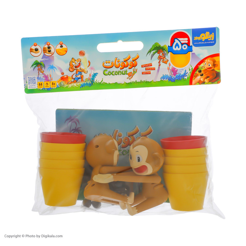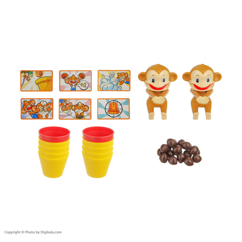 | اقلام همراه | 2 زمینه ی بازی2 میمون تیرانداز10 لیوان (2 عدد قرمز و 8 عدد زرد)20 نارگیل6 کارت بازی |