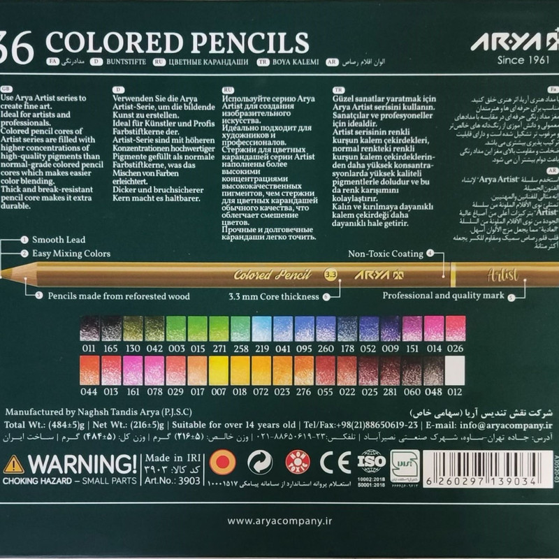 مداد رنگی ۳۶ رنگ آریا آرتیست، انتخابی ایدهآل برای هنرمندان حرفهای، دانشآموزان هنر و علاقهمندان به نقاشی است. این مجموعه در یک جعبه فلزی مقاوم و زیبا ارائه میشود که هم حمل آسان و هم محافظت از مدادها را تضمین میکند. مدادهای این سری دارای مغزی نرم و روان هستند که رنگدانههای غنی و شفاف آنها به راحتی روی انواع کاغذ منتقل میشود. تنوع رنگ بالا، امکان ترکیب طیف وسیعی از رنگها را برای خلق آثار هنری جذاب فراهم میکند. بدنهی ارگونومیک مدادها از چوب با کیفیت ساخته شده و در دست گرفتن آنها حس خوبی به هنرمند میدهد.